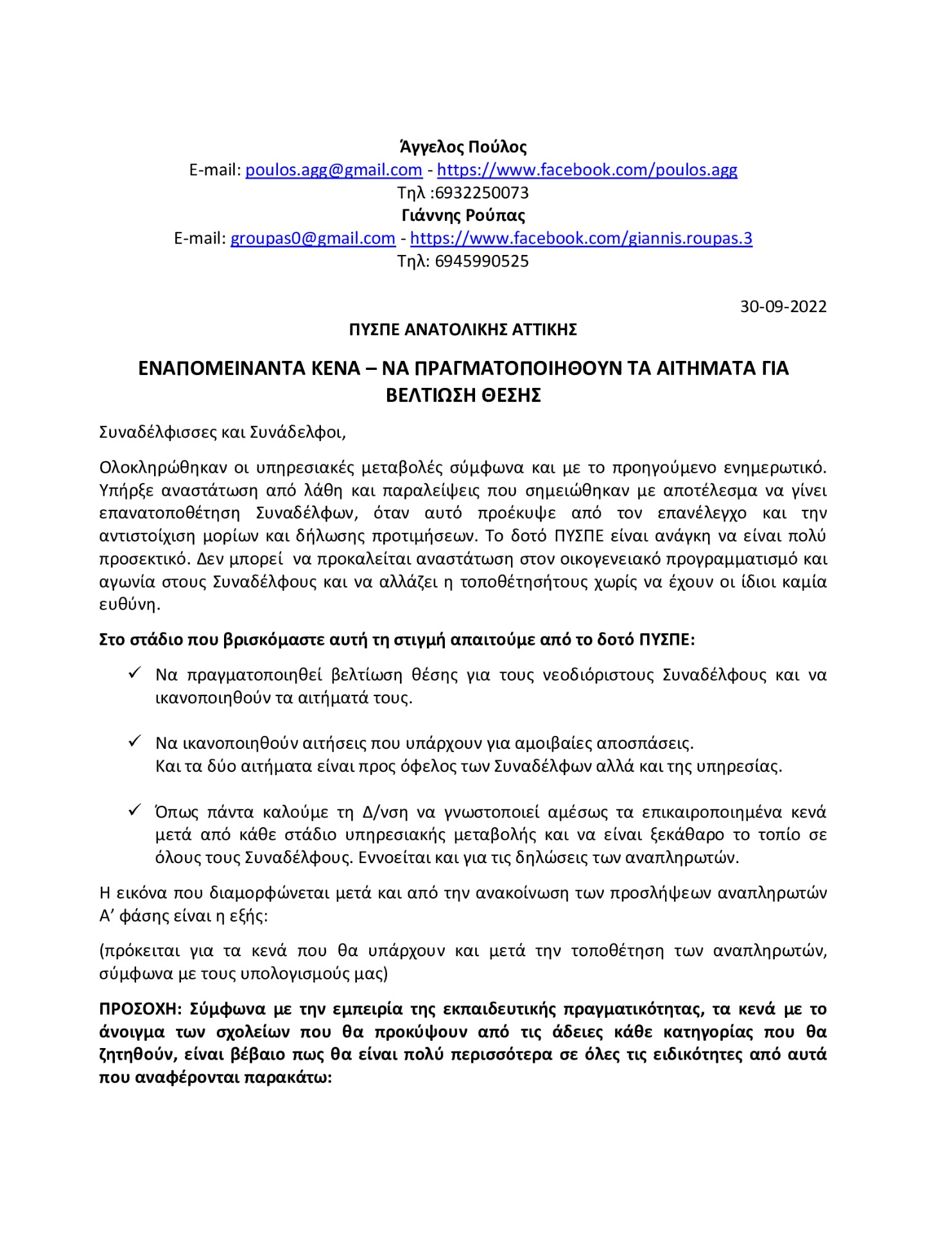 2022-08-30 ΠΥΣΠΕ ΑΝΑΤΟΛΙΚΗΣ ΑΤΤΙΚΗΣ ΕΝΑΠΟΜΕΙΝΑΝΤΑ ΚΕΝΑ – ΝΑ ΠΡΑΓΜΑΤΟΠΟΙΗΘΟΥΝ ΤΑ ΑΙΤΗΜΑΤΑ ΓΙΑ ΒΕΛΤΙΩΣΗ ΘΕΣΗΣ